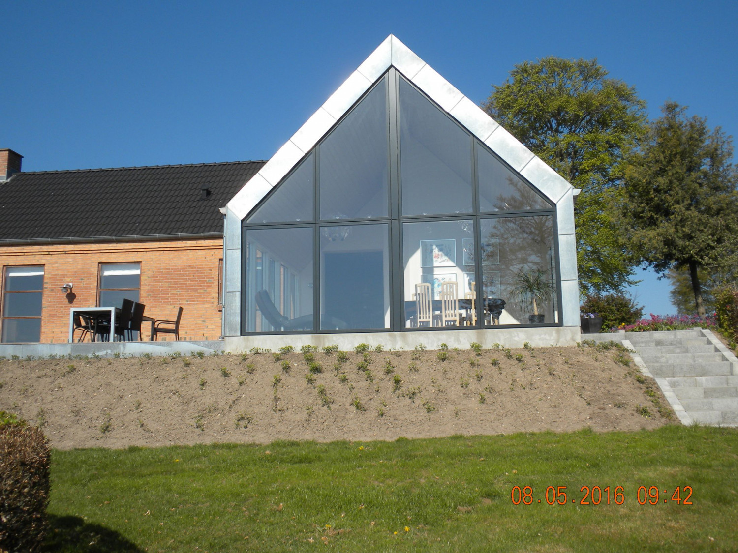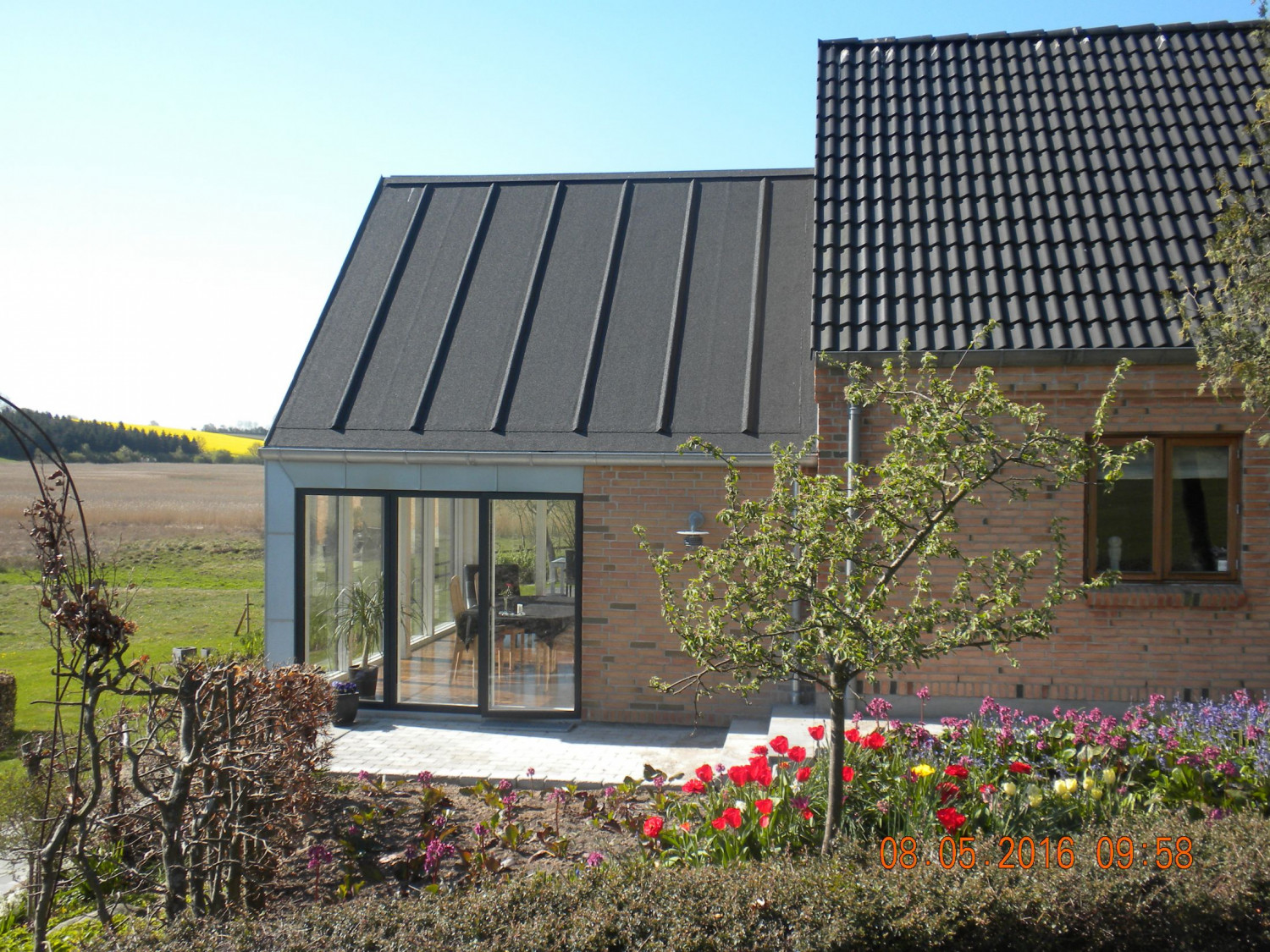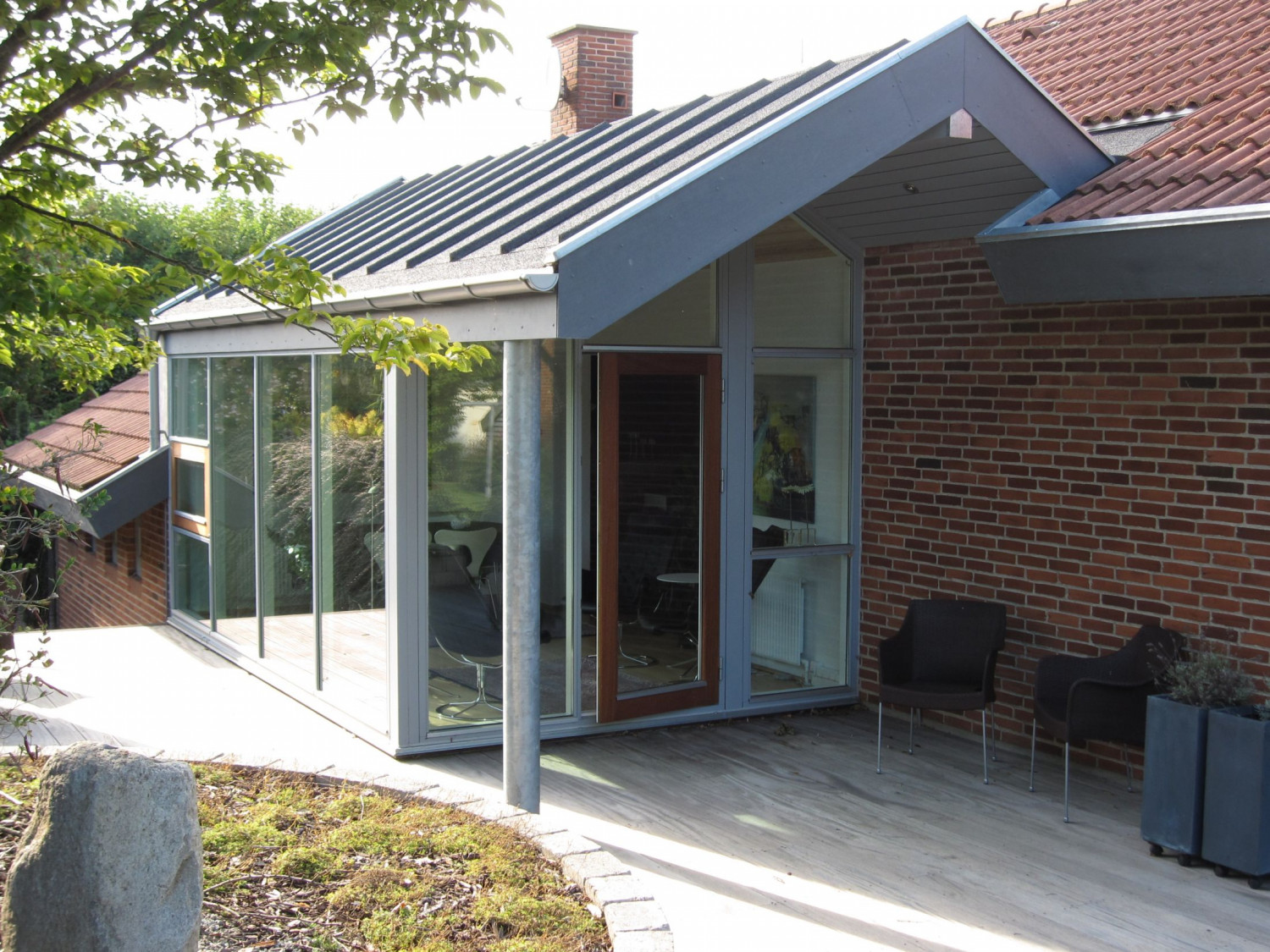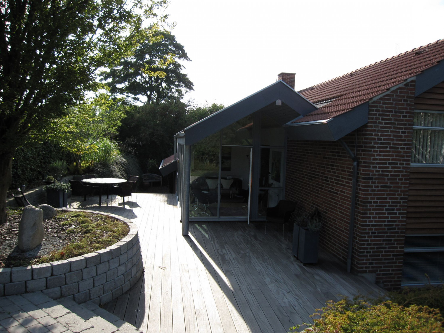 Her har vi hjulpet kunden med at opføre en stor udestue med loft til kip, og store vinduespartier, som giver et flot lysindfald fra alle 3 åbne sider.
